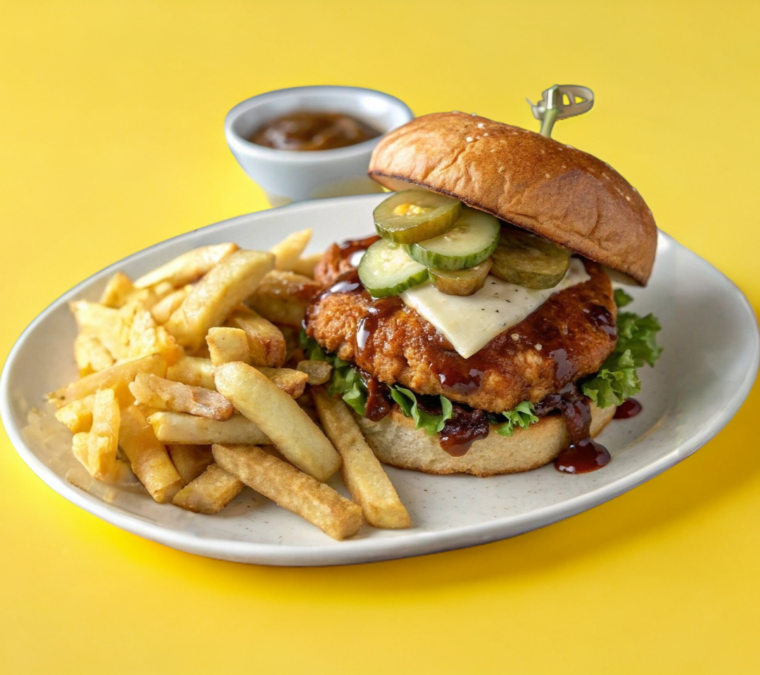 Hamburguesa de 2 tiras de pollo bañada en BBQ, Queso manchego, Cebolla caramelizada, lechuga y pepinillos y 100g de papas a la francesa