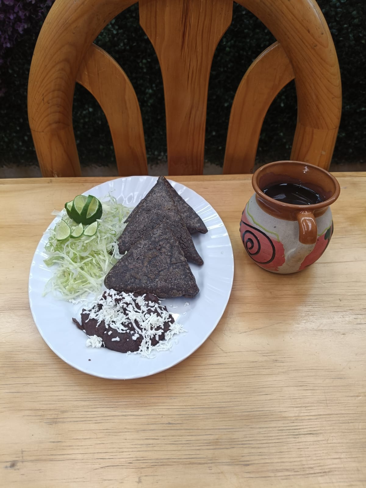 Totopos doraditos con salsa, queso rallado, crema y cebolla, acompañados de frijoles negros refritos