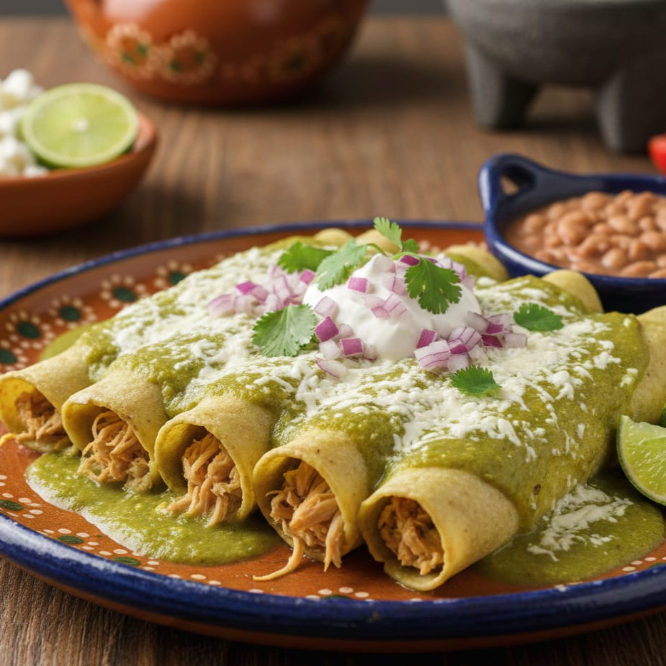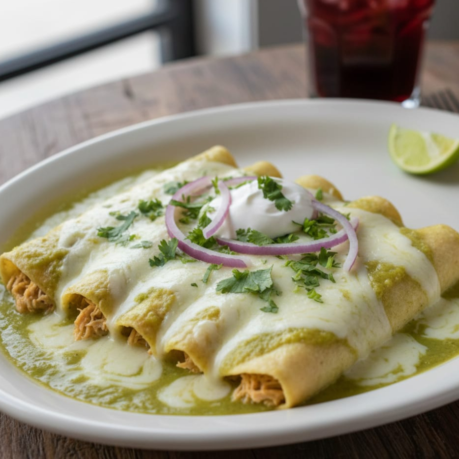 Orden de 5 enchiladas de pollo, con crem queso, lechuga, bañadas en nuestro delicioso chile verde.