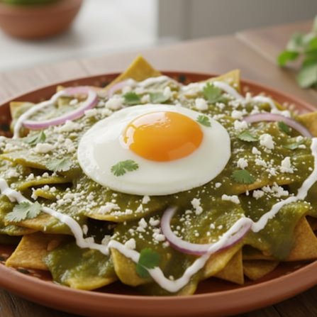 Deliciosos chilaquiles verdes con huevo estrellado, queso, crema y lechuga. Tamaño Grande.