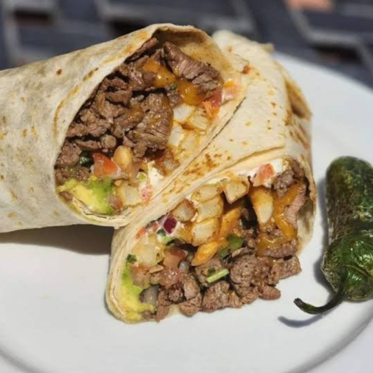 Delicioso burrito, con tortilla de harina burrera, frijoles, papas, lechuga y huevito a la mexicana.