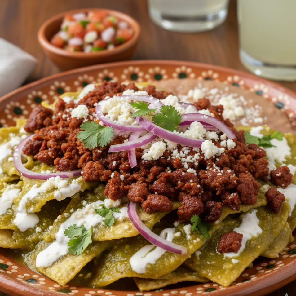 Deliciosos chilaquiles verdes con chorizo, queso, crema y lechuga. Tamaño Grande.