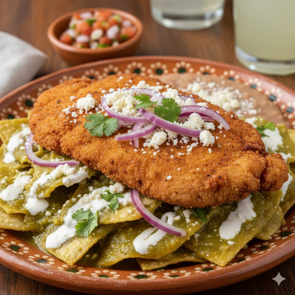 Deliciosos chilaquiles verdes con milanesa de pollo, queso, crema y lechuga. Tamaño Grande.
