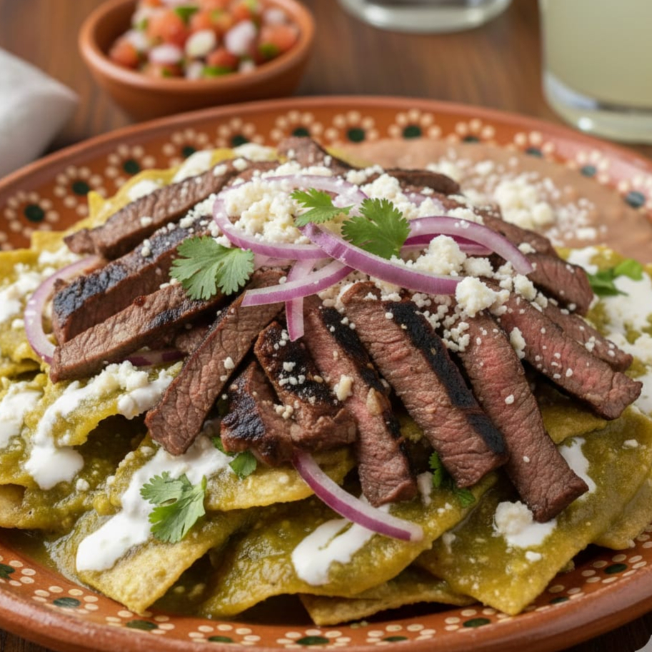 Deliciosos chilaquiles verdes con bistec, queso, crema y lechuga. Tamaño Grande.