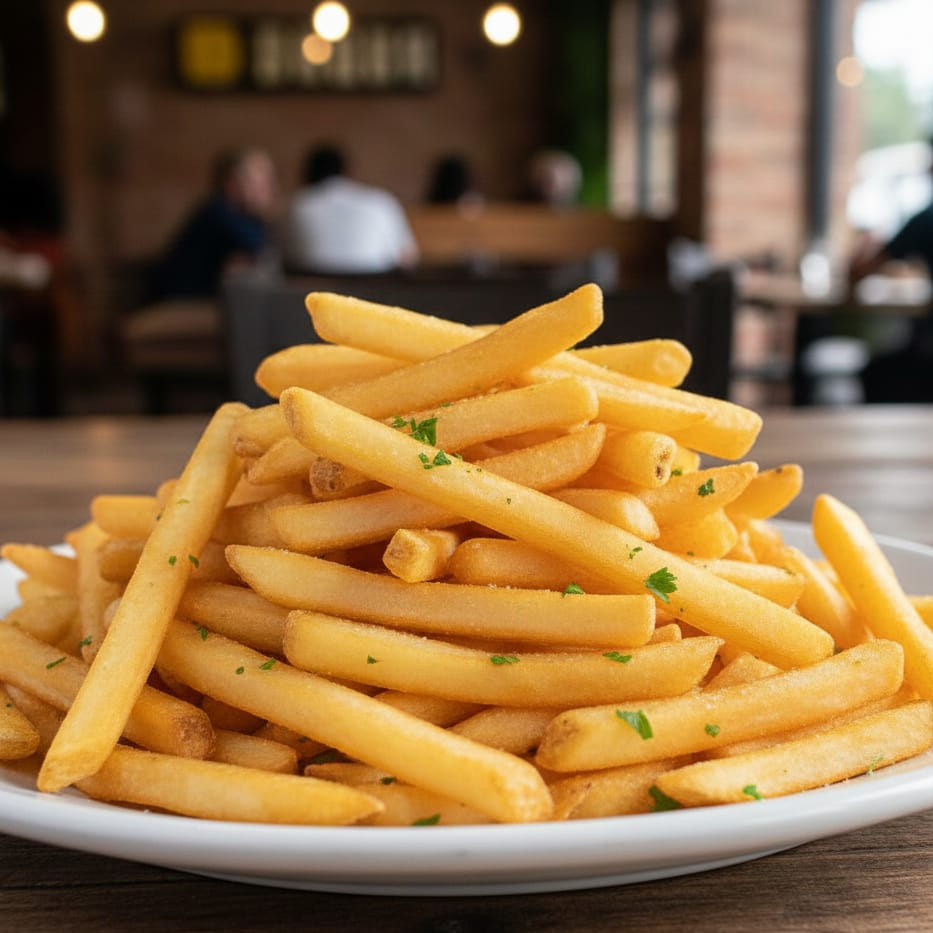 Orden individual de papas a la francesa recién hechas, con aderezos a elección