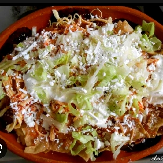 Totopos bañados en salsa verde con pollo lechuga queso y crema