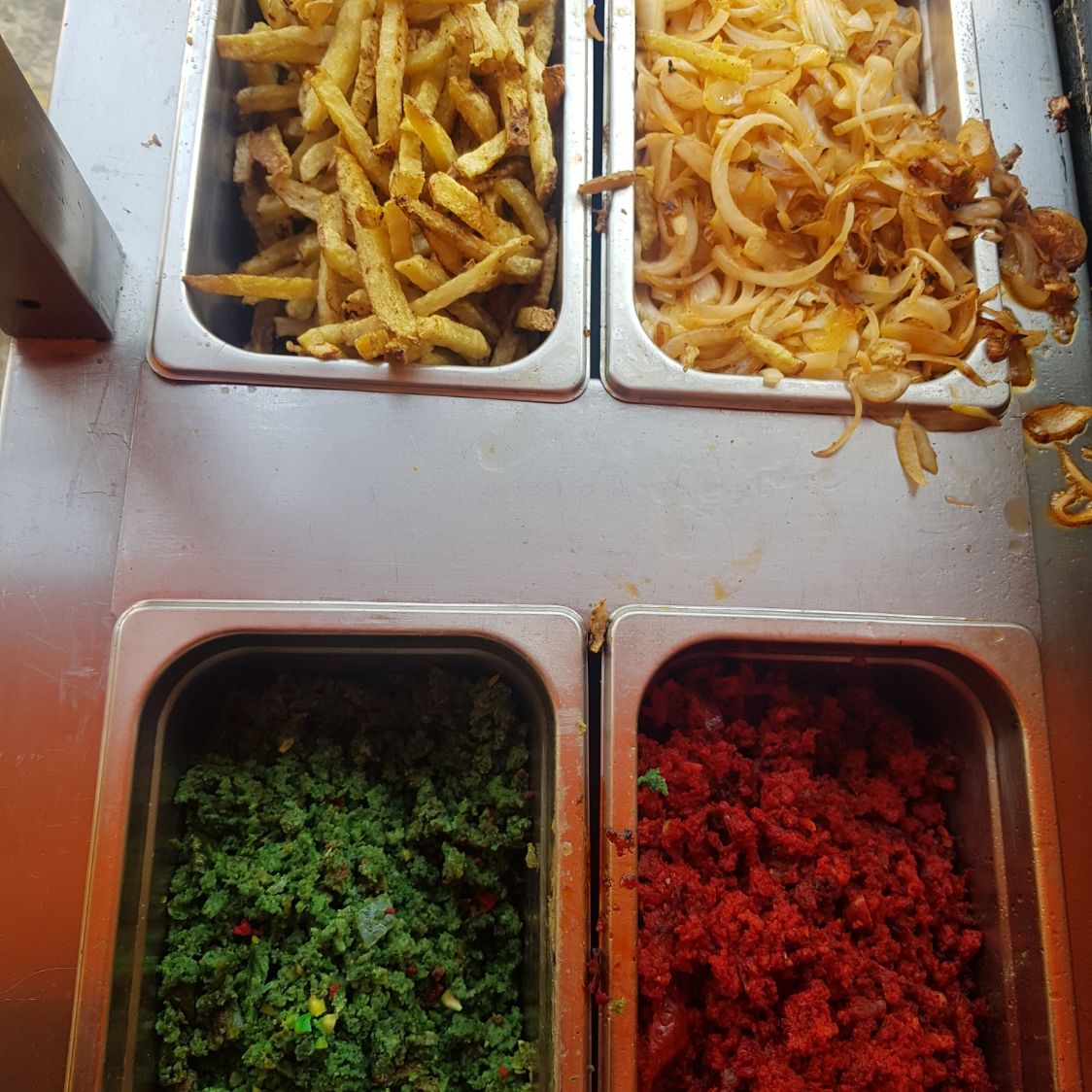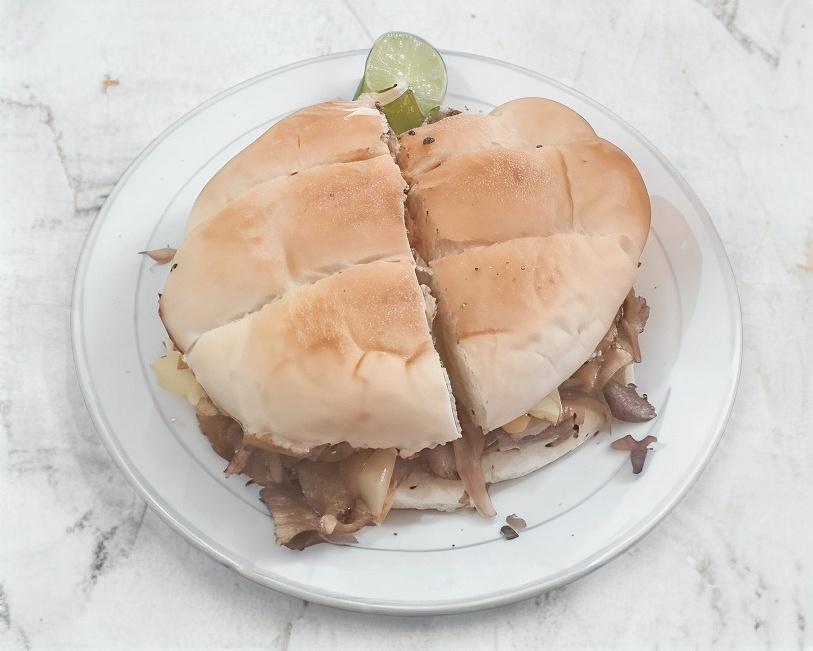 Tortilla dorada en aceite, con papas a la francesa, cebolla, queso manchego fundido en la plancha y carne a elegir.
