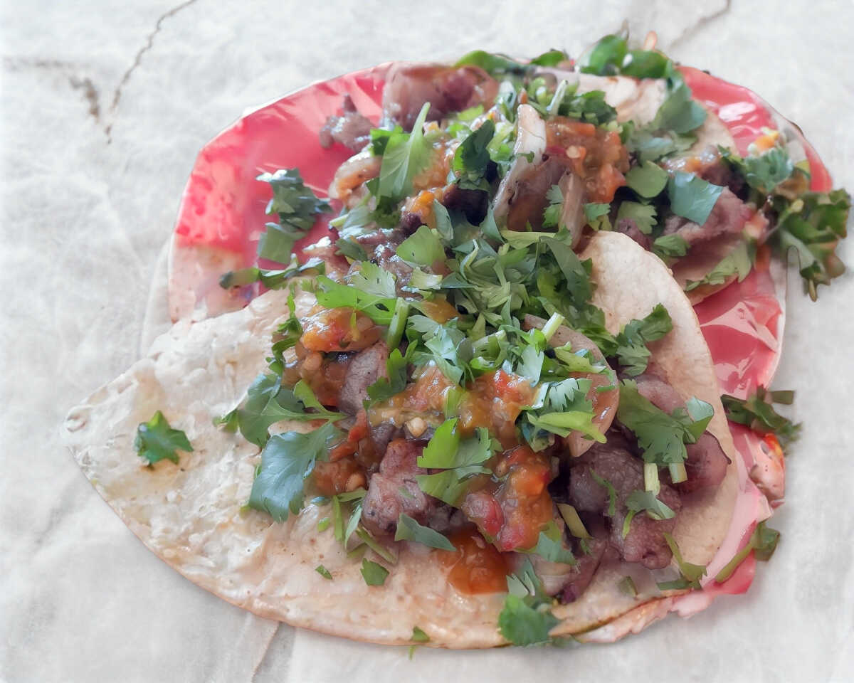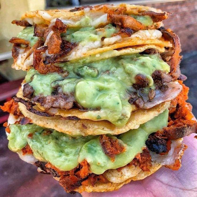 Tortilla de maiz con queso oaxaca, cecina, adobada y chorizo rojo.