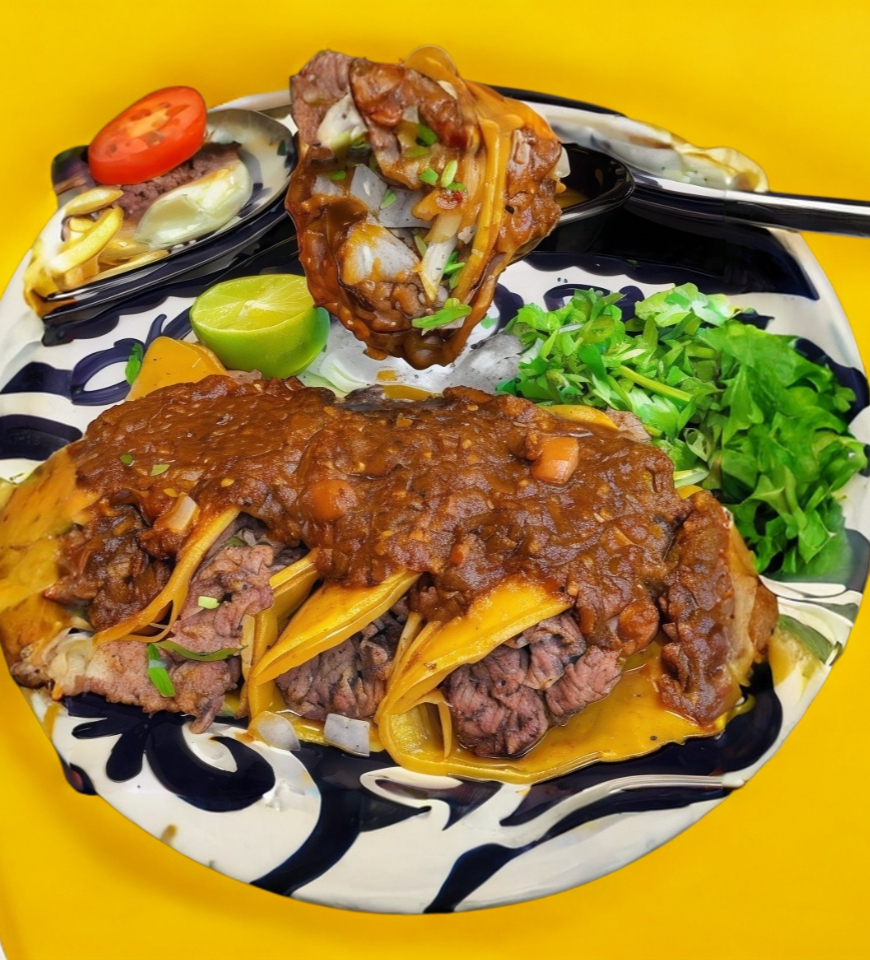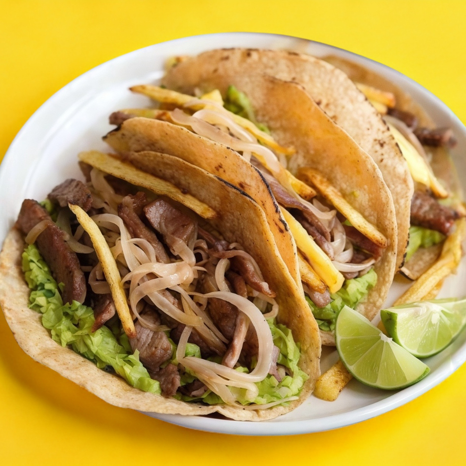 Tortilla de maíz con queso Oaxaca, cecina, papas a la francesa y cebollas asadas.