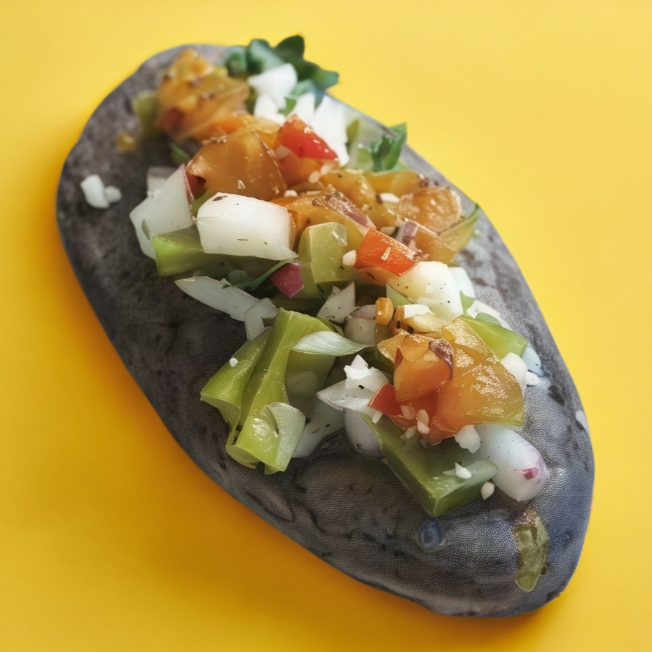 Tortilla de maíz, queso Oaxaca, papas, cebolla y nopales.