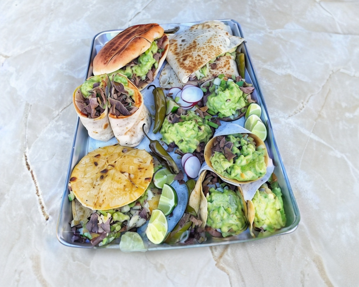 Carne cocida acompañada de limones, salsas, tortillas, papas a la francesa, nopales y cebollas asadas.
