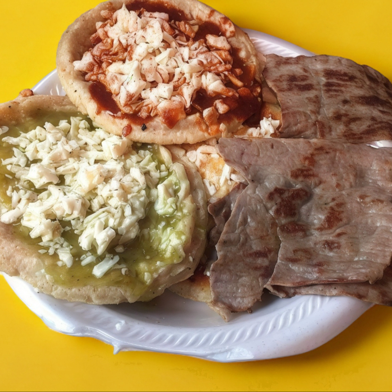 Gordita tradicional de chicharrón prensado con carne a elección acompañado de cebolla, papas y nopales.