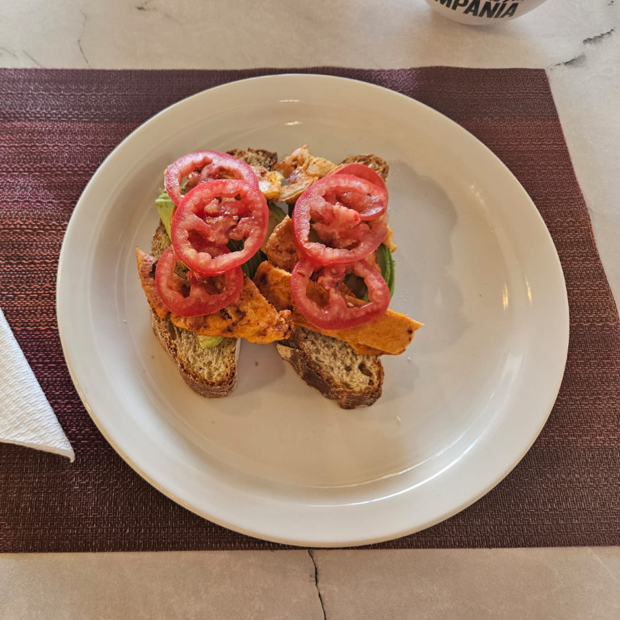 Con aguacate y pechuga asada al chipotle. Fruta, jugo, pancito con matequilla, café de olla, americano o té