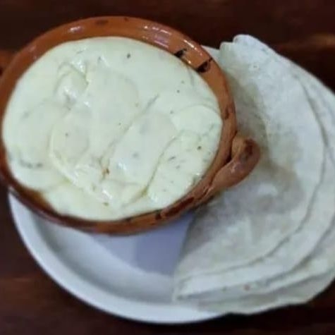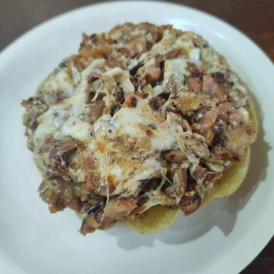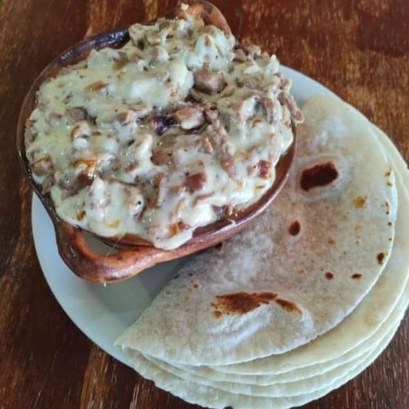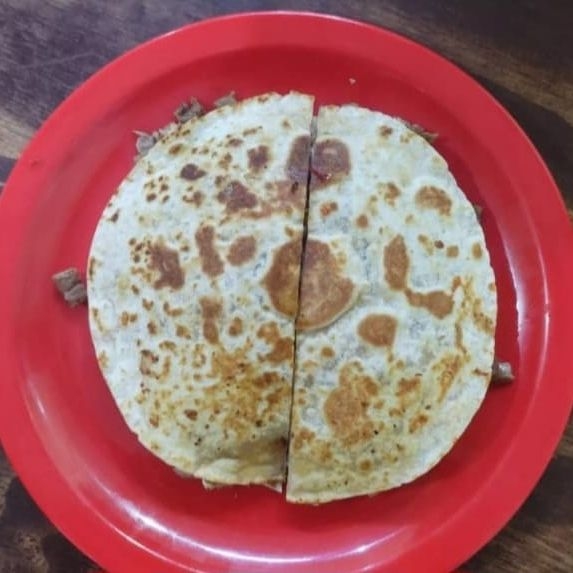 Carne de pastor con queso asadero en dos tortillas de harina.