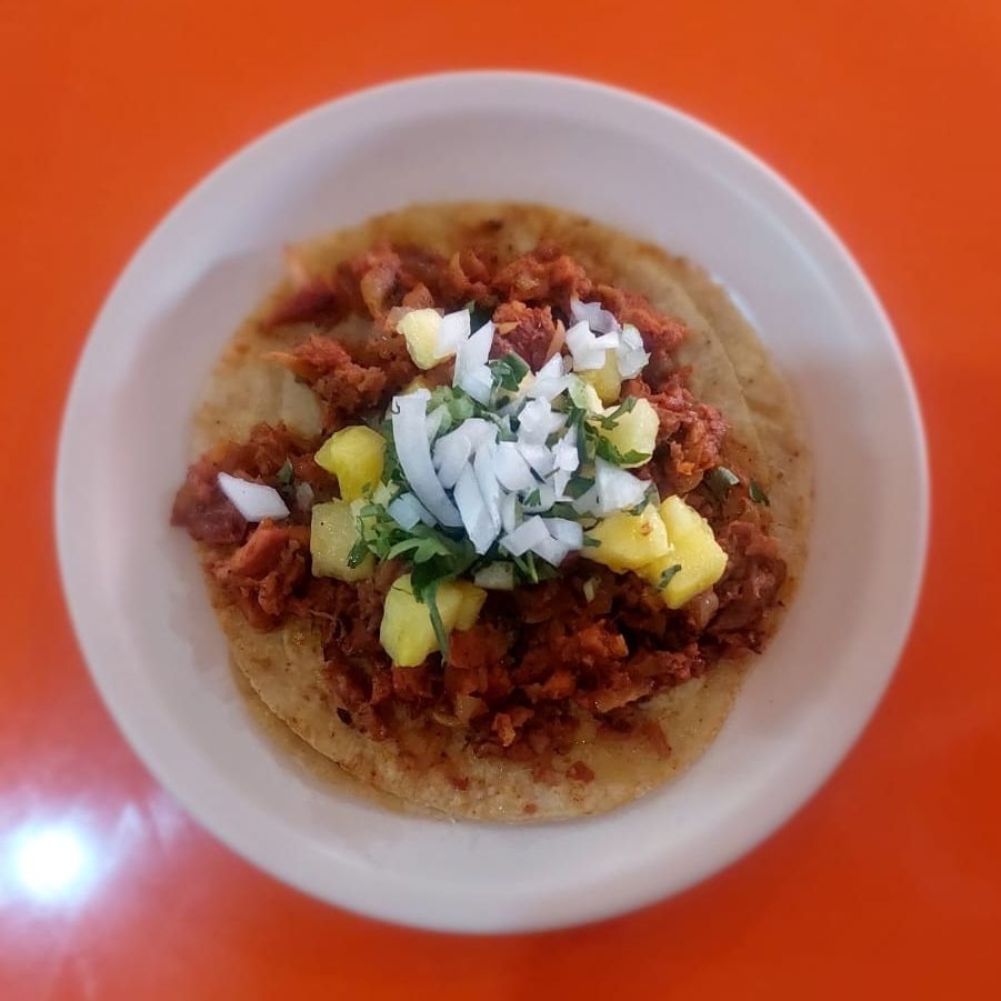 Preparados con tortilla de maíz, carne de cerdo, cebolla, cilantro y piña.