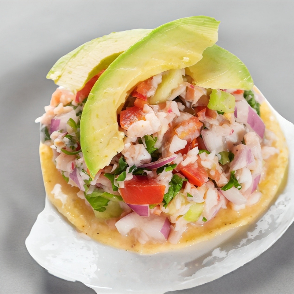 Ceviche de camarón fresco servido sobre tostada con un toque de cilantro y aguacate.
