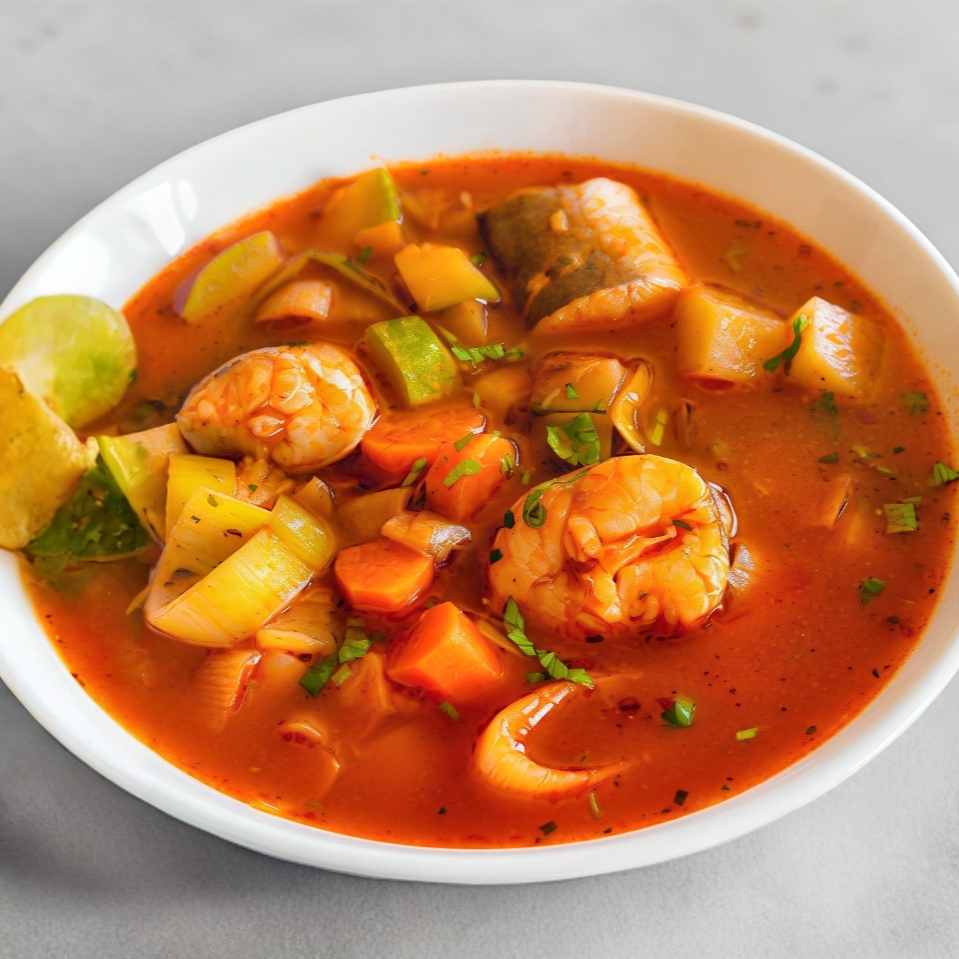 Caldo tradicional de camarón con verduras y especias, tamaño mediano.
