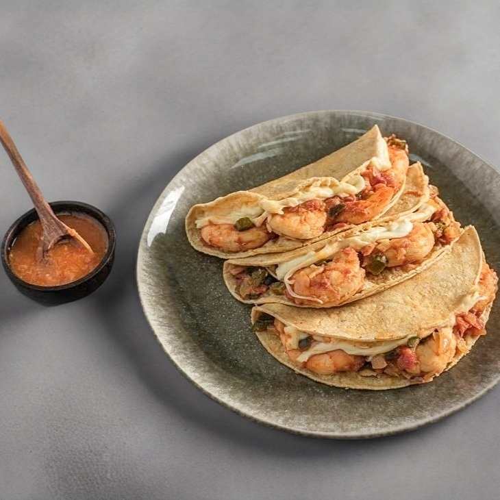 Tortilla de maíz rellena de camarón guisado con queso derretido y pimientos.