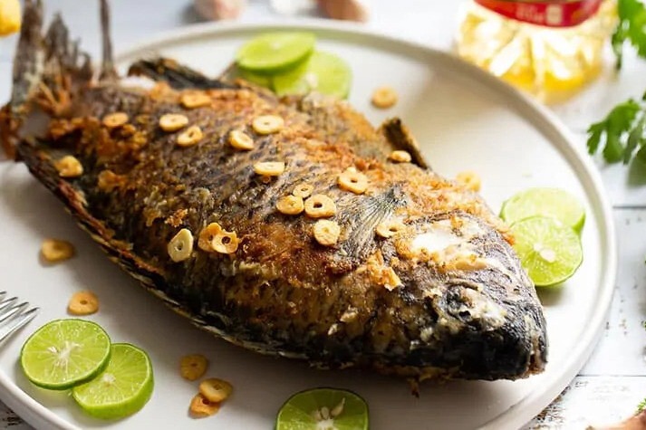 Mojarra preparada con abundante ajo dorado.