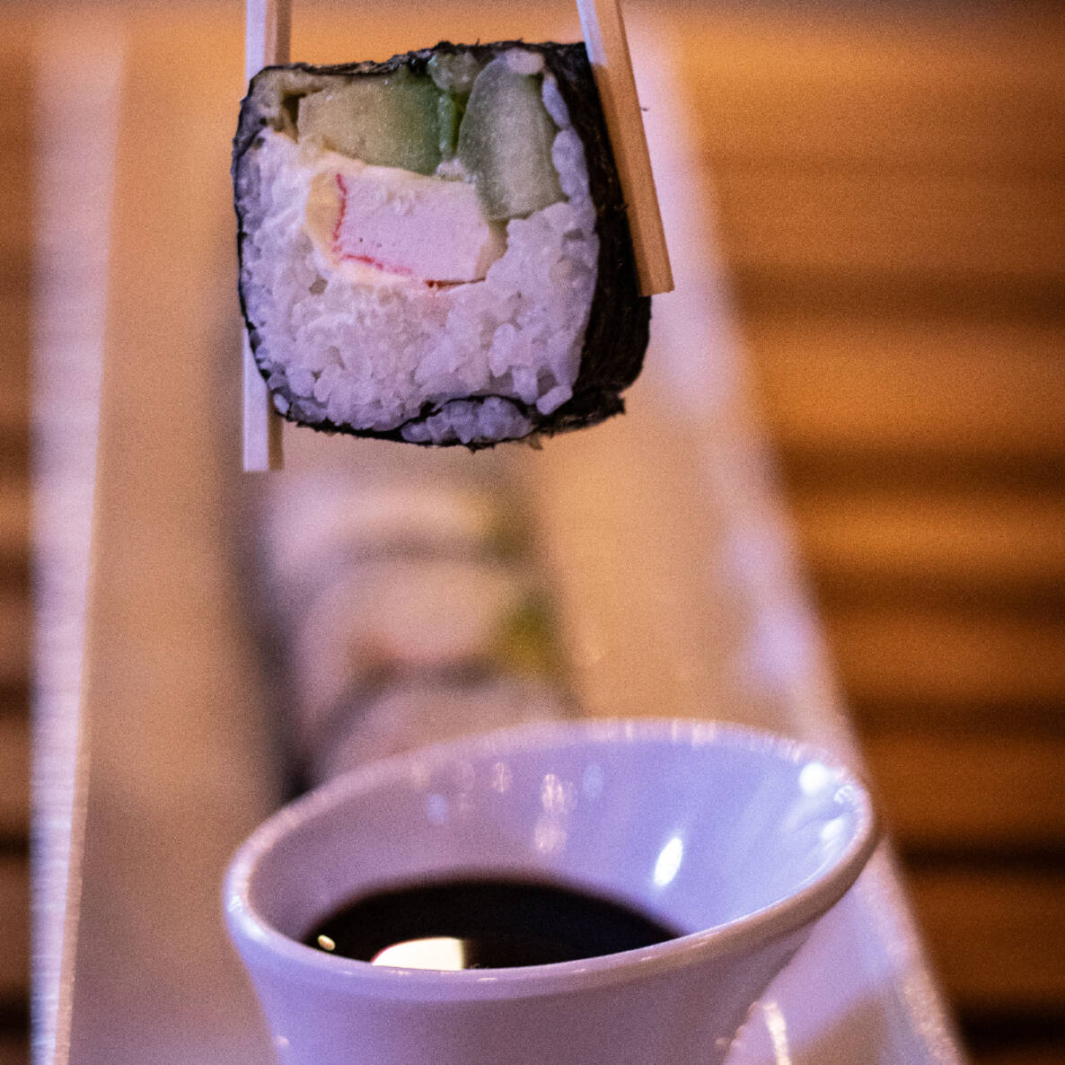 Rollo relleno de surimi, pepino y queso crema envuelto en alga nori.