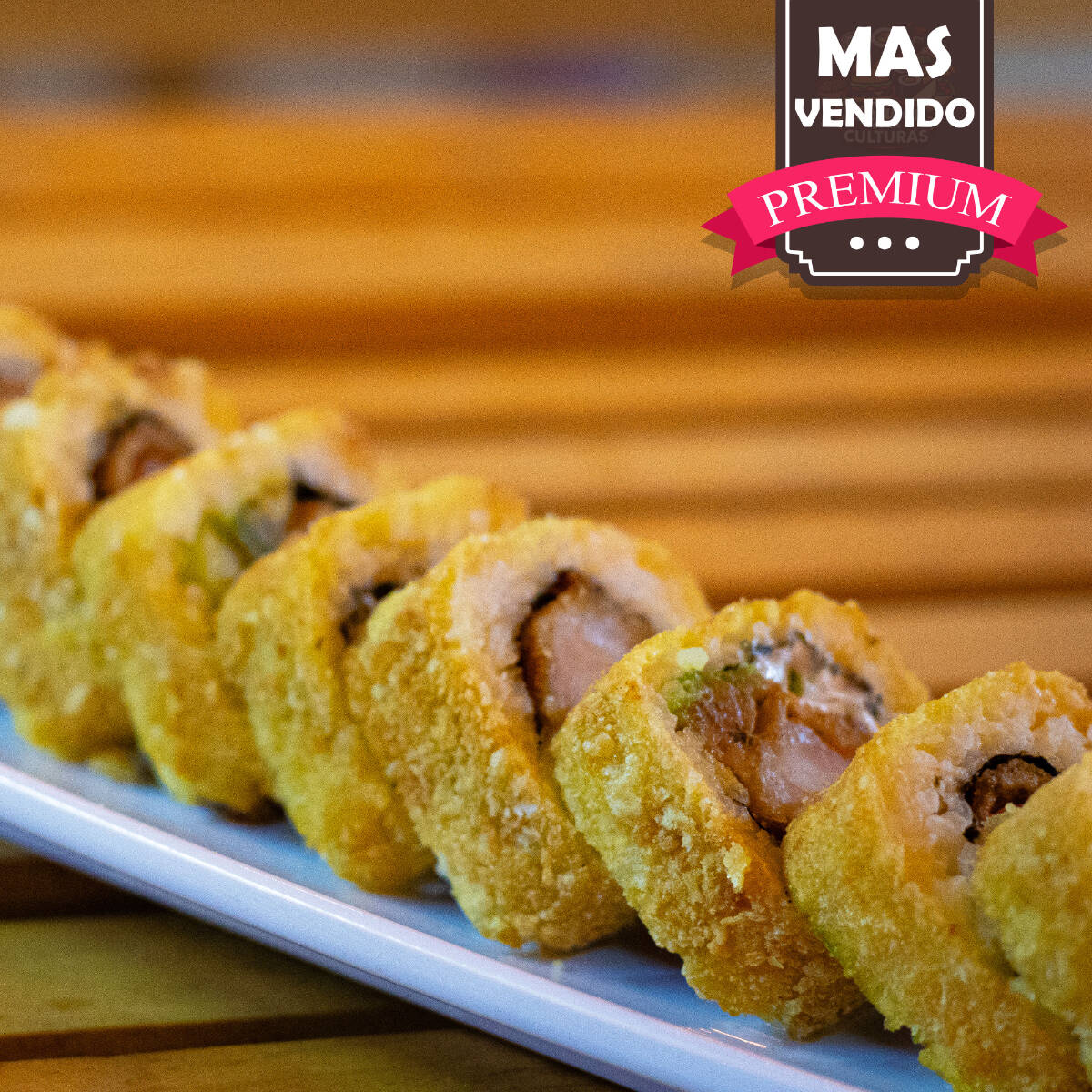 Rollo frito con panko y tempura relleno de camarón empanizado.