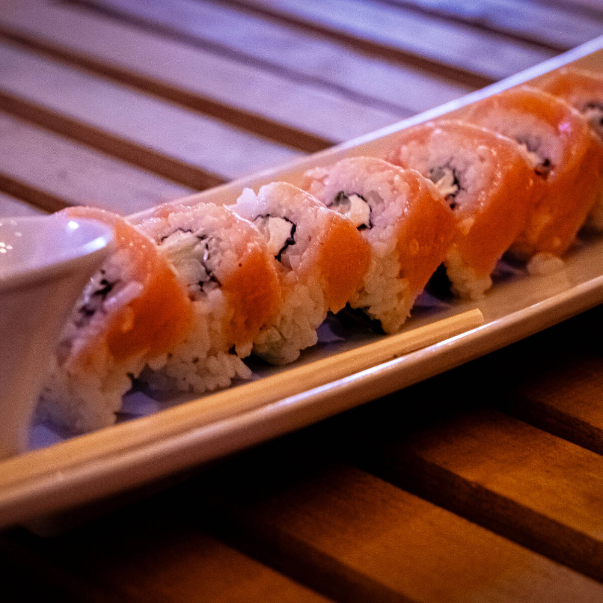 Rollo relleno de pepino, aguacate y queso crema envuelta por salmón fresco.