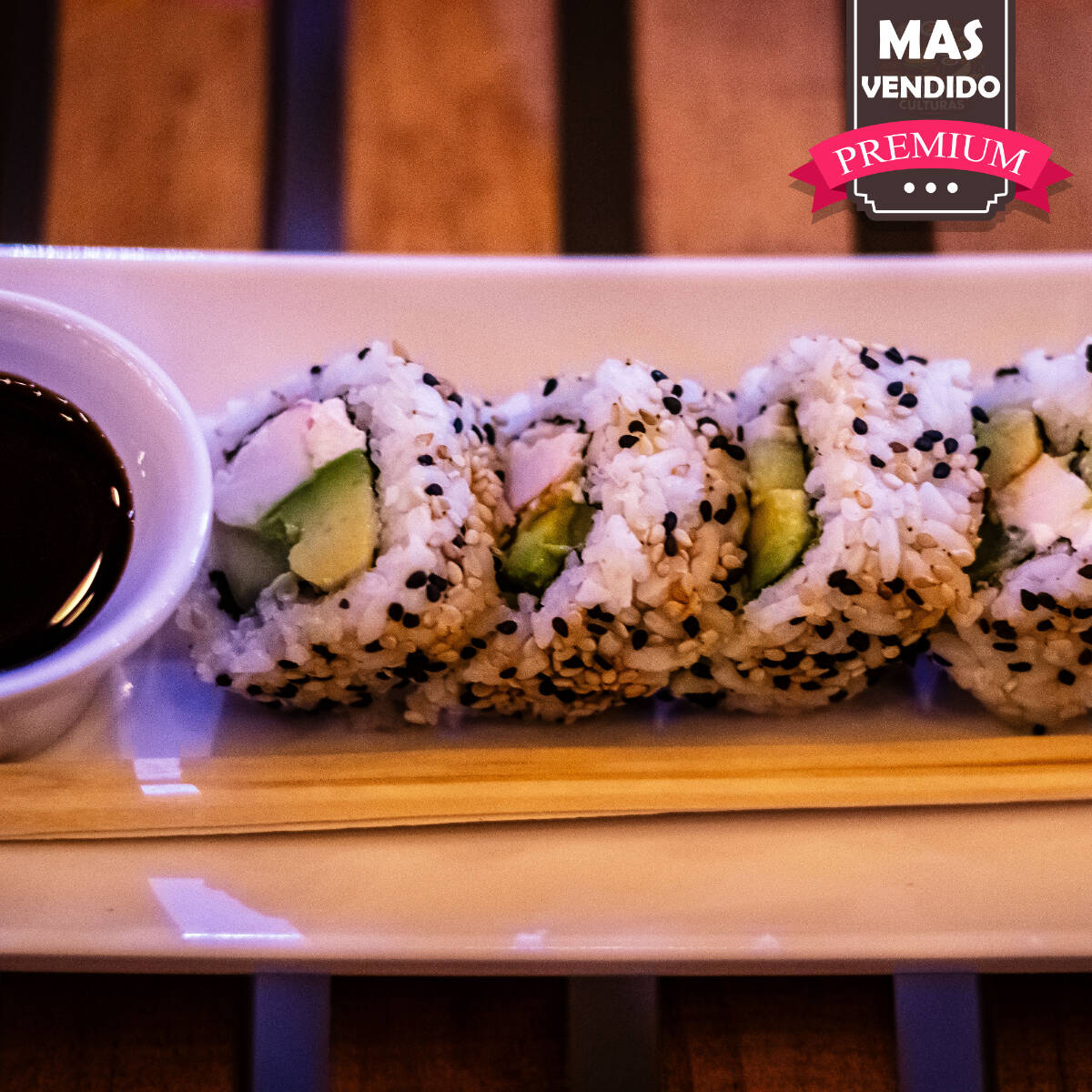 Rollo relleno de aguacate, pepino, queso crema y surimi.