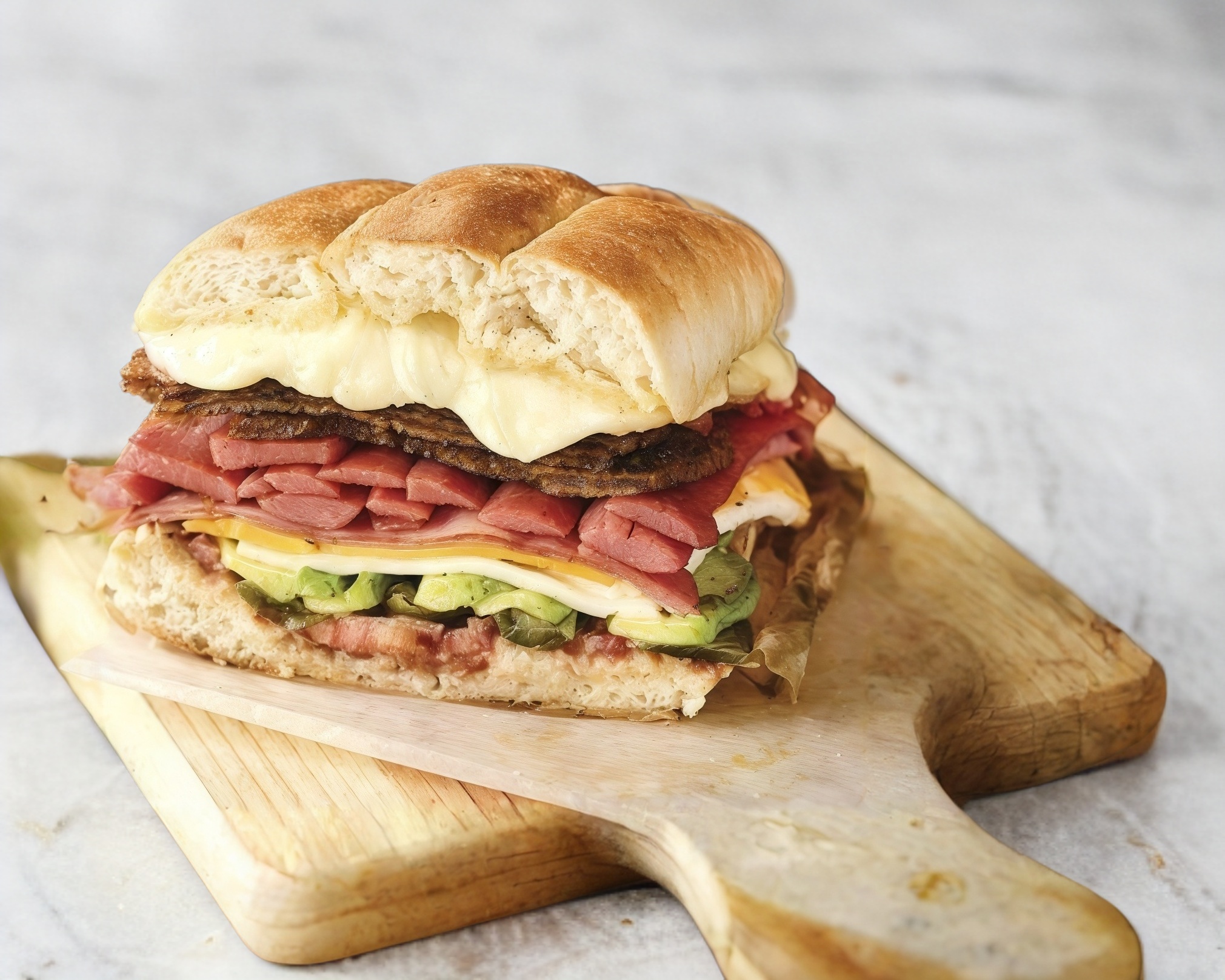 Torta de tamaño normal, crocante relleno de queso blanco, queso amarillo y queso oaxaca