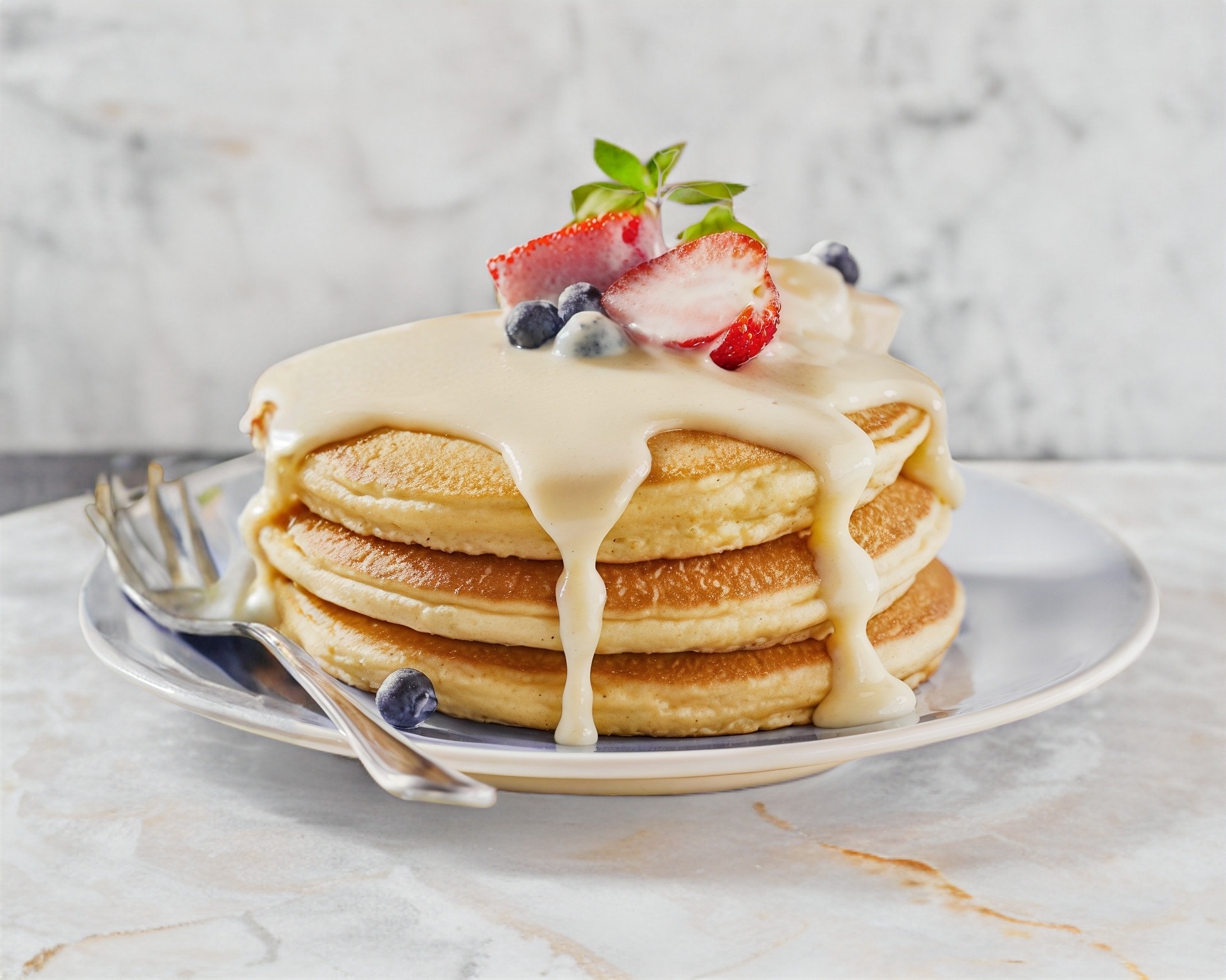 12 mini hot cakes, con fruta de temporada, lechera, cajeta y granillo
