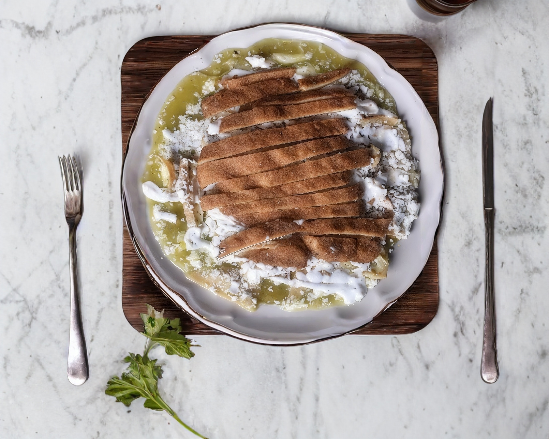 Totopos bañados en salsa verde o solicitando la salsa aparte, lechuga, queso y crema