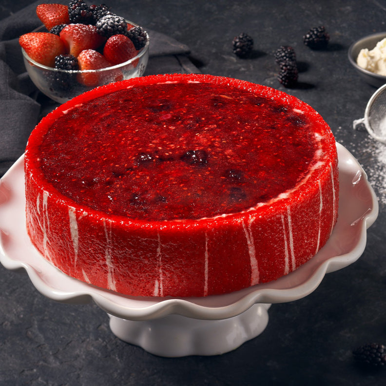 Delicioso pastel elaborado con un suave bizcocho de vainilla, un toque de jarabe de tres leches, relleno con crema y una capa de cheesecake al centro. Decorado con frutos rojos y una soleta roja al canto.