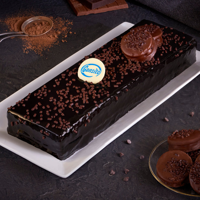 Delicioso pastel hecho con chocolate Carlos V ® , embebido con un jarabe de chocolate intenso, relleno con suave crema de chocolate Carlos V ®