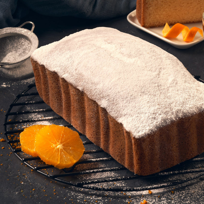 Panqué con trocitos de naranja confitada y 100% mantequilla, decorado con azúcar glass.