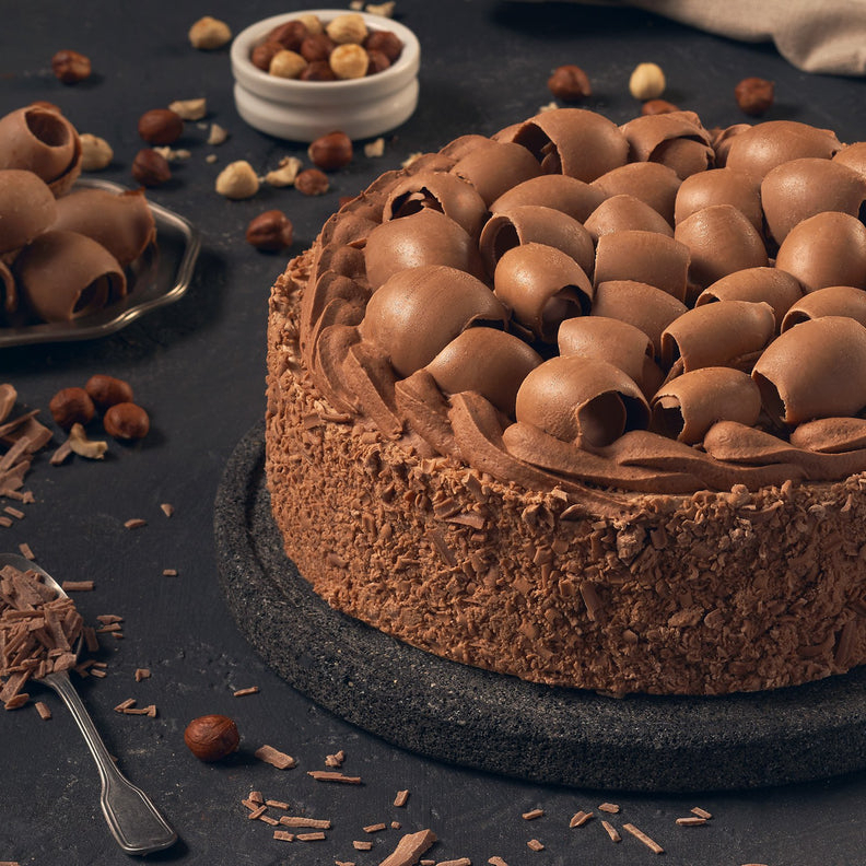 Único y original pastel de chocolate embebido con jarabe marrasquino, relleno de crema de chocolate y avellanas, decorado de exquisitos rizos de chocolate de leche elaborados artesanalmente