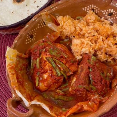 Delicioso; sabroso y tradicional Mixiote de carne de puerco o pollo en achiote sazonado con verduras. Acompañados con una porción de frijoles, arroz, tortillas y agua de fruta.