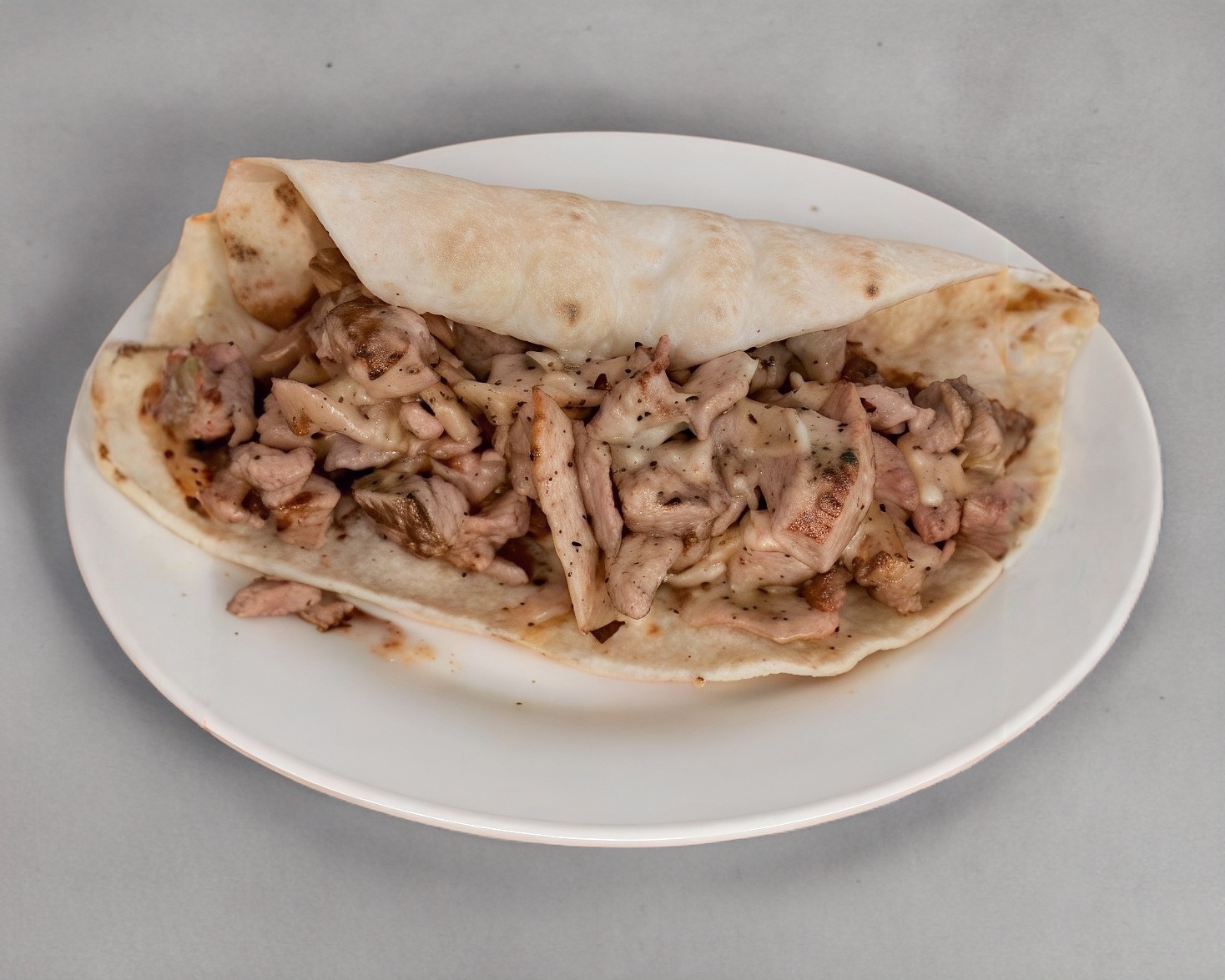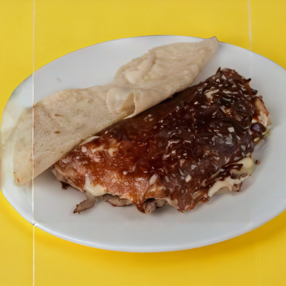 Gringa de pastor en dos tortillas de harina, rellenas de una porción generosa de carne al pastor, queso, salsa de la casa y limones.