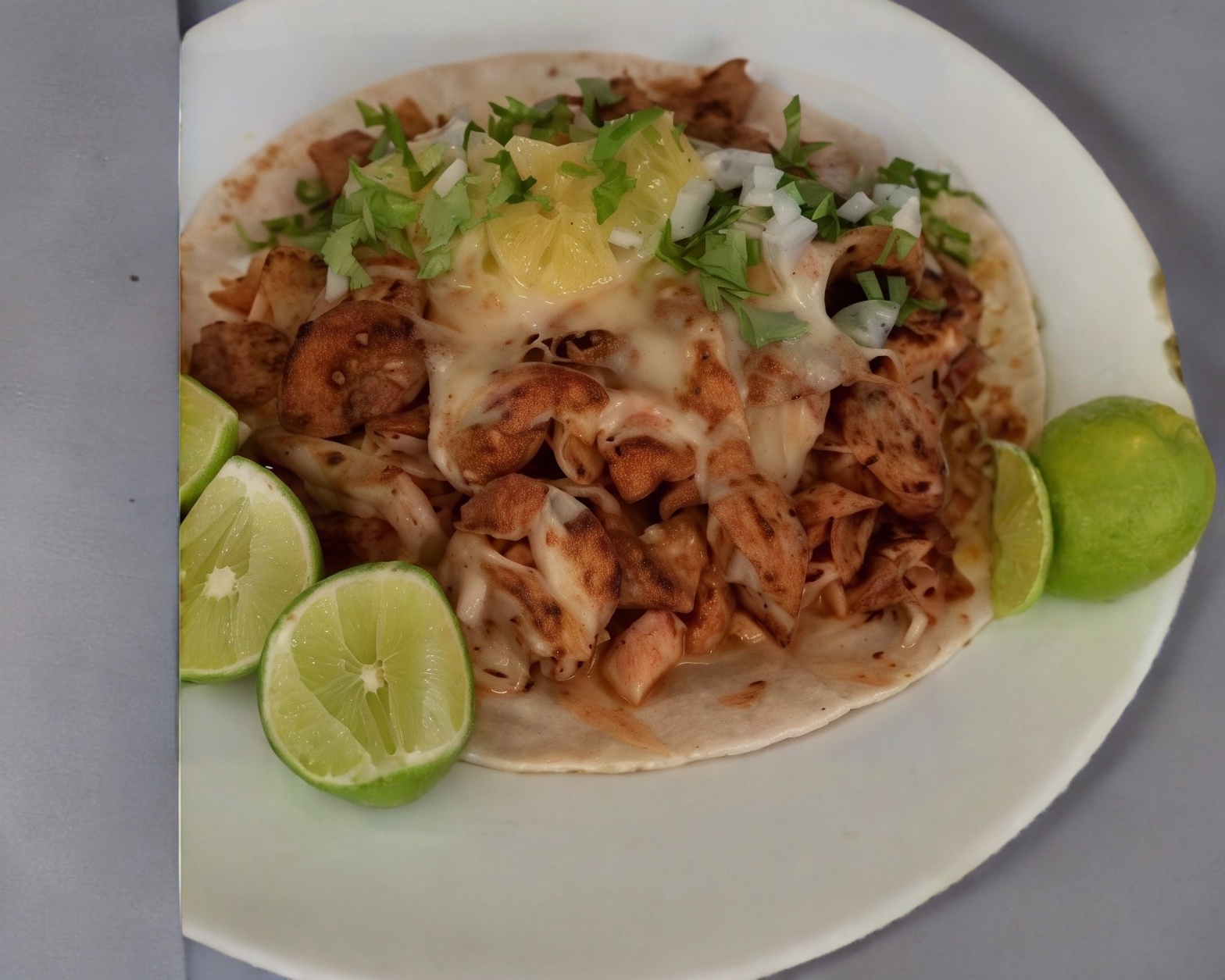 Costra de queso con 200 g de chuleta, acompañado de tortillas de harina salsa de la casa y limones.