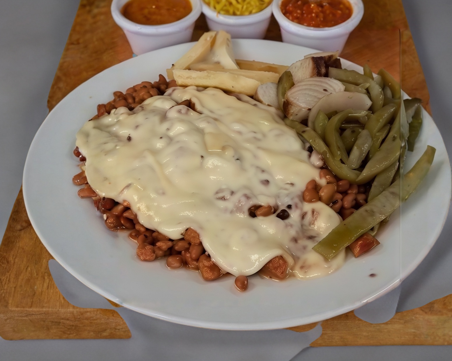 Orden de costilla con queso 400 g, acompañado de nopales, cebollitas, papas francesas, 4 tortillas de maíz, salsa de la casa y limones.