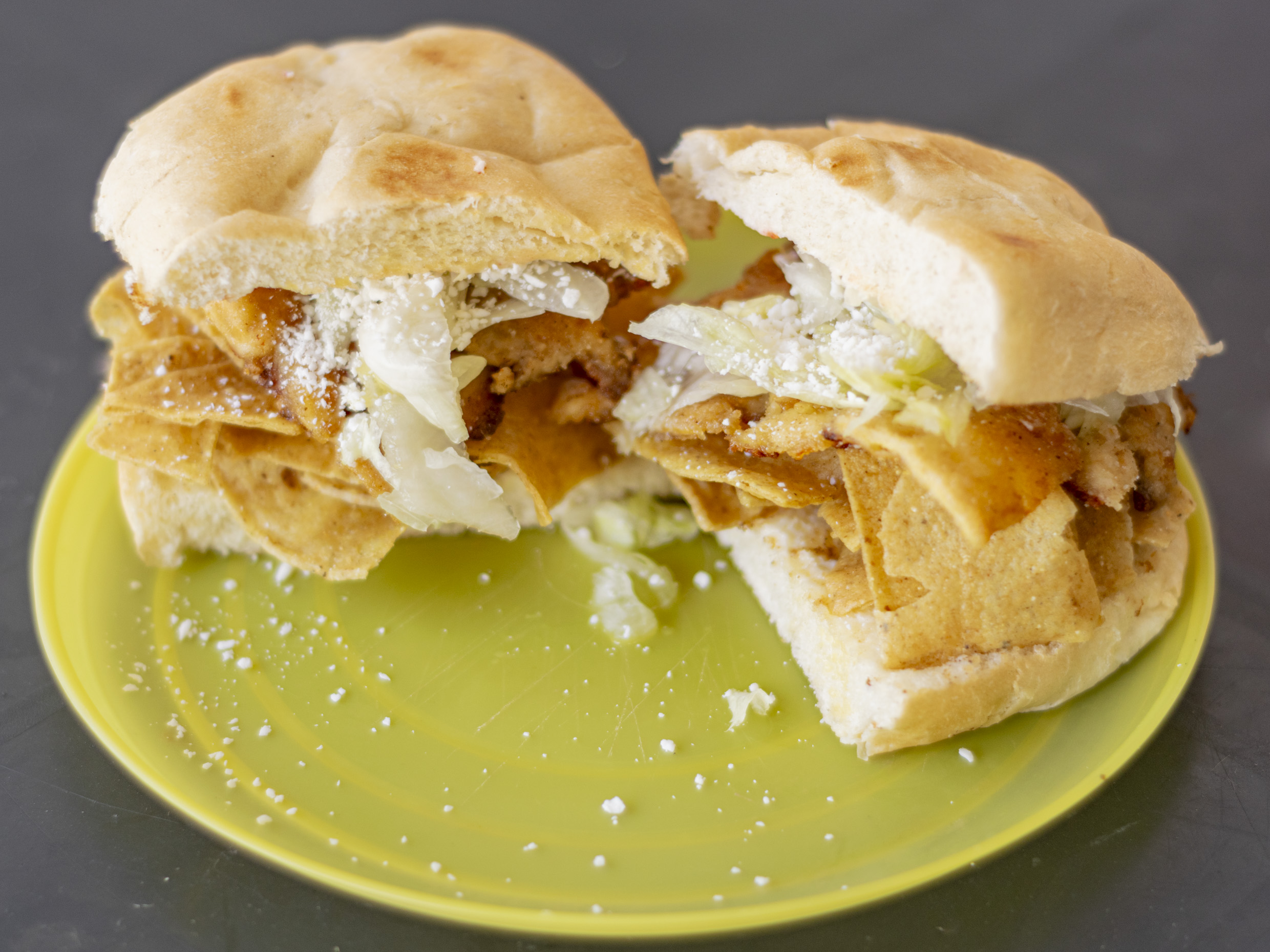 2 tortillas grandes,milanesa de pollo,papa,nopal,cebolla,salsa,limones
