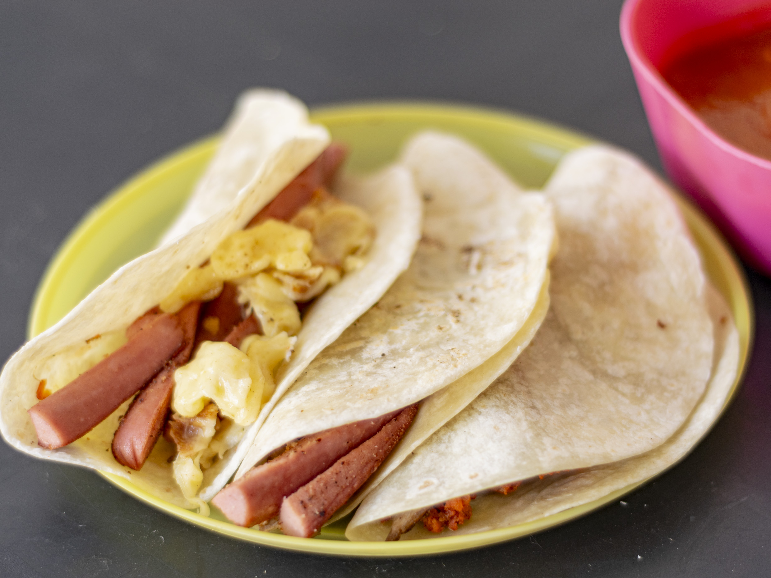 tortilla de harina,salchicha con jitomate y cebolla,q mosarella fundido ,salsa