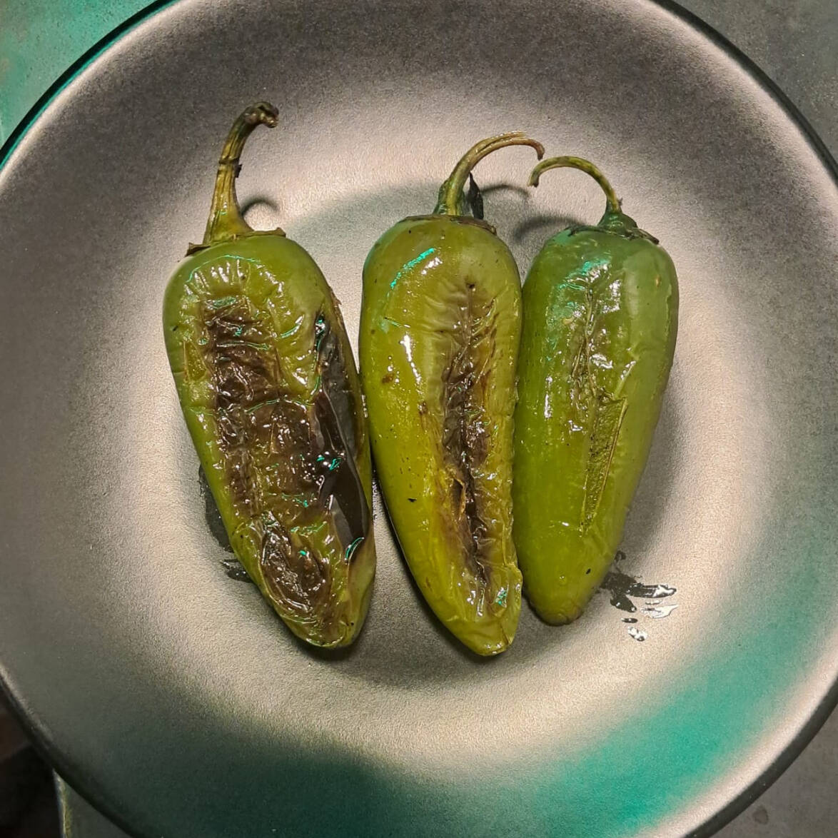 Chiles Toreados, sazonados con salsa Maguie y sal de ajo