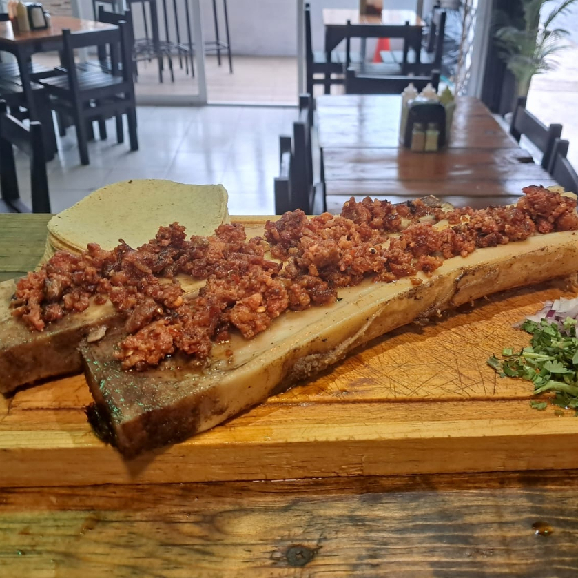 Orden de Tuétano Asado bañado con Chorizo acompañado de Tortillas, Cebolla y Cilantro (separado)