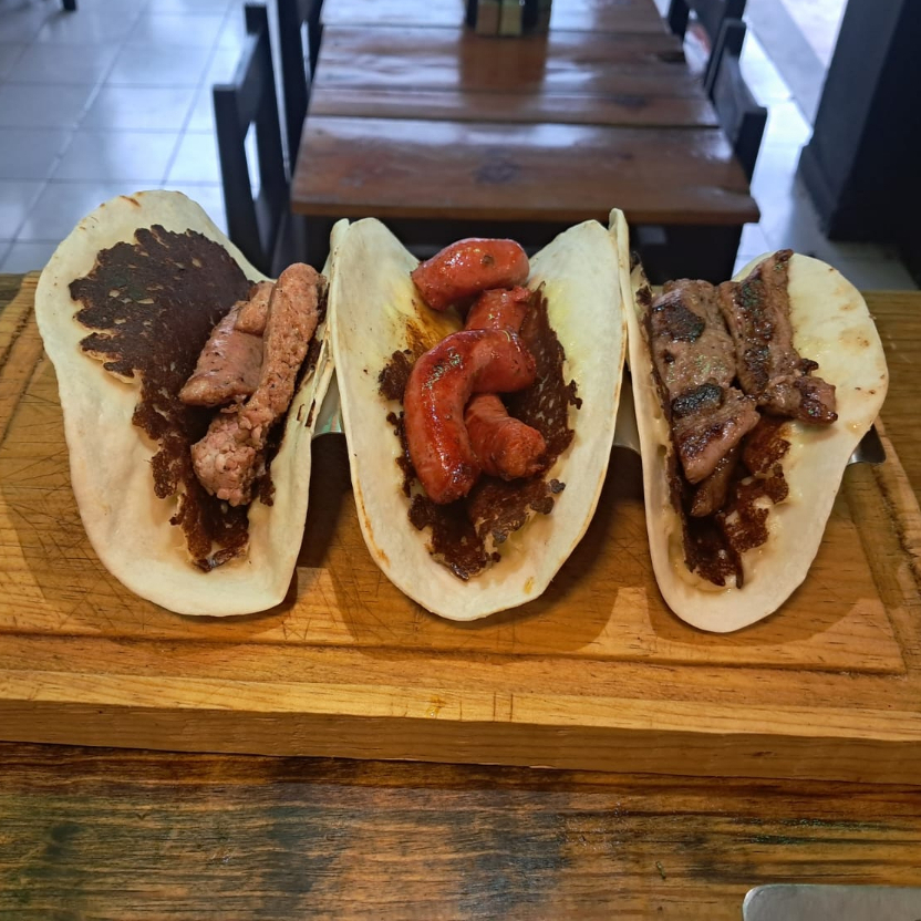 Incluye 3 tacos Gourmet, 1 de Arrachera, 1 de Chistorra y 1 de Chorizo Argentino con una costra de queso c/u (salseado con chimichurri, miel al vino tinto y miel moztaza)