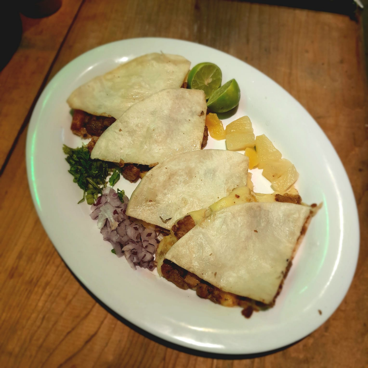 Gringa de Chorizo c/queso (Tortilla de Harina Tamaño Regular) acompañada con cebolla, cilantro y piña (separada)