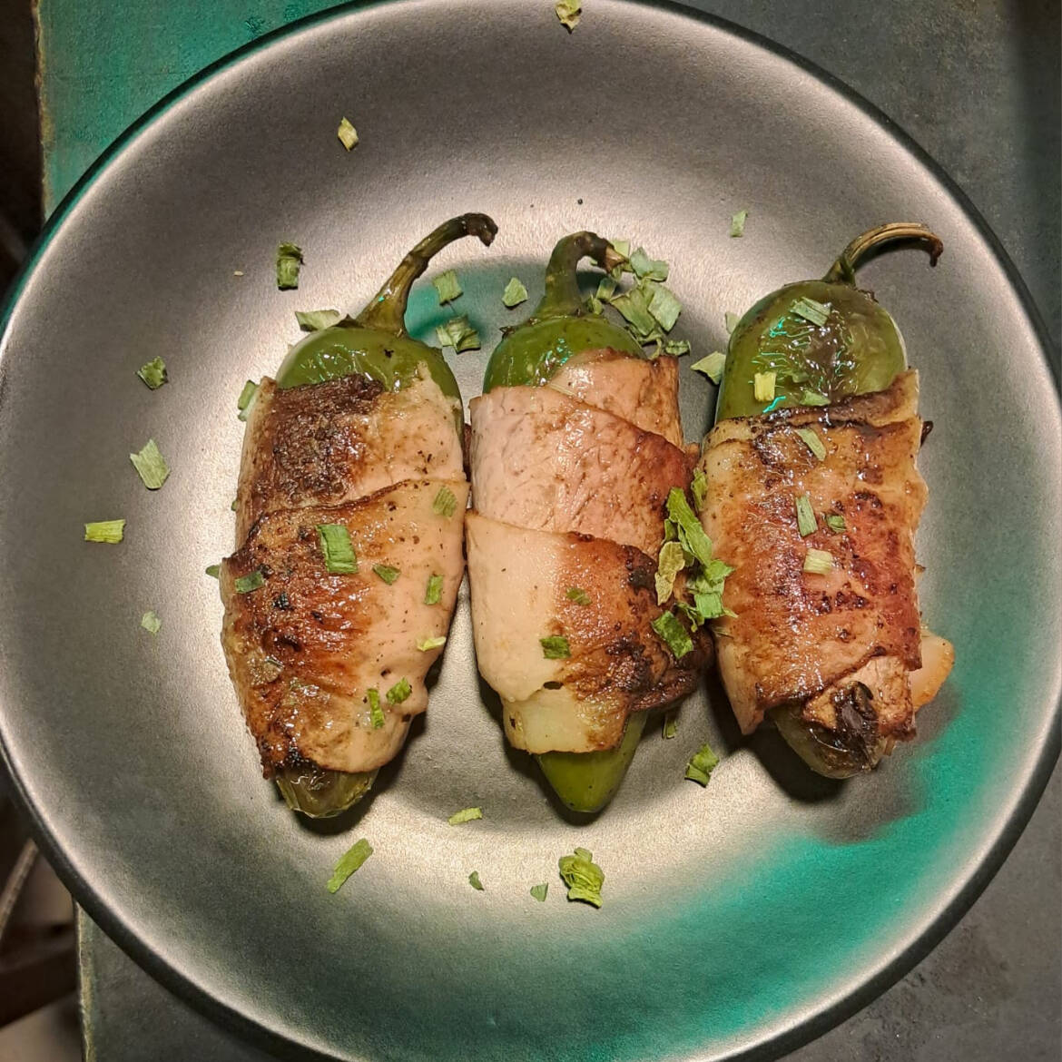 Chiles Toreados rellenos de queso Philadelphia y envueltos en Tocino (3pz)