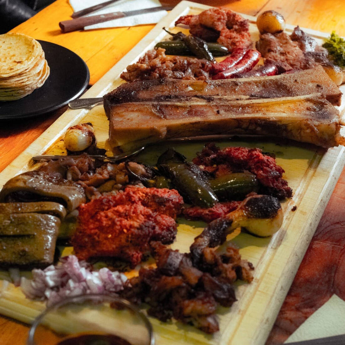 Parrillada Familiar con Arrachera, Chistorra, Chorizo Argentino, Longaniza, Suadero, Tripa, Bistec, Acompañado de 1 Tuétano Asado, con guarnición de Cebolla Cambray, Chiles Toreados, Cebolla y cilantro picado, 4 mini quesadillas, y Tortillas. (recomendado para 4 personas)
