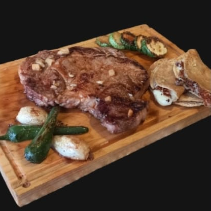 300 gr de Ribeye sazonado a la mantequilla con ajo, queso gratinado coronado con camarones salteados y finalizado con un flameado de Mezcal que realza los sabores. acompañado de quesadillas, cebolla cambray, chile toreado, calabazas y Tortillas (separado)