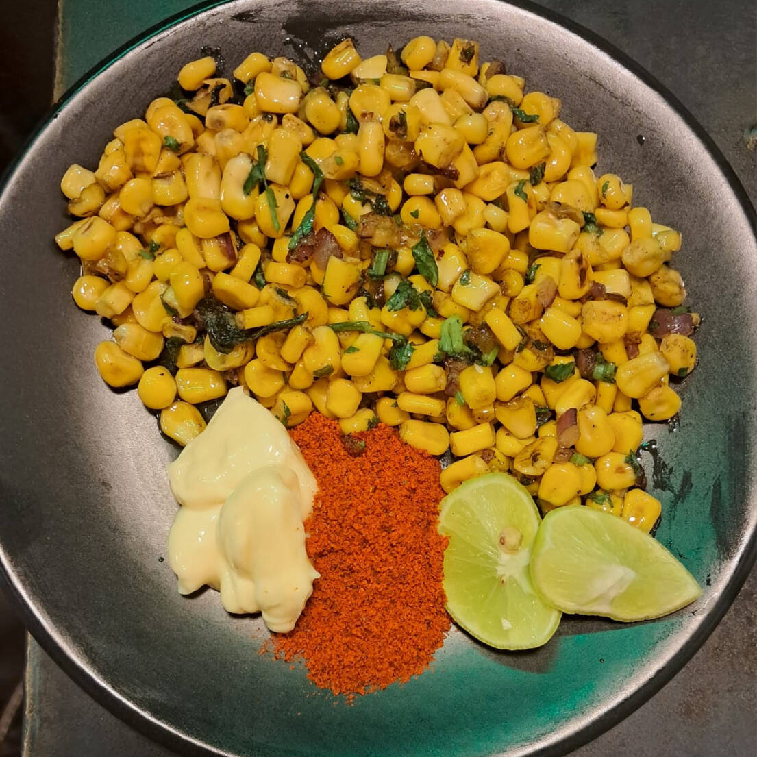 Esquites preparados de manera Tradicional con epazote y cebolla finamente picada, acompañados con Mayonesa, Limon y Chile Piquin (separado)
