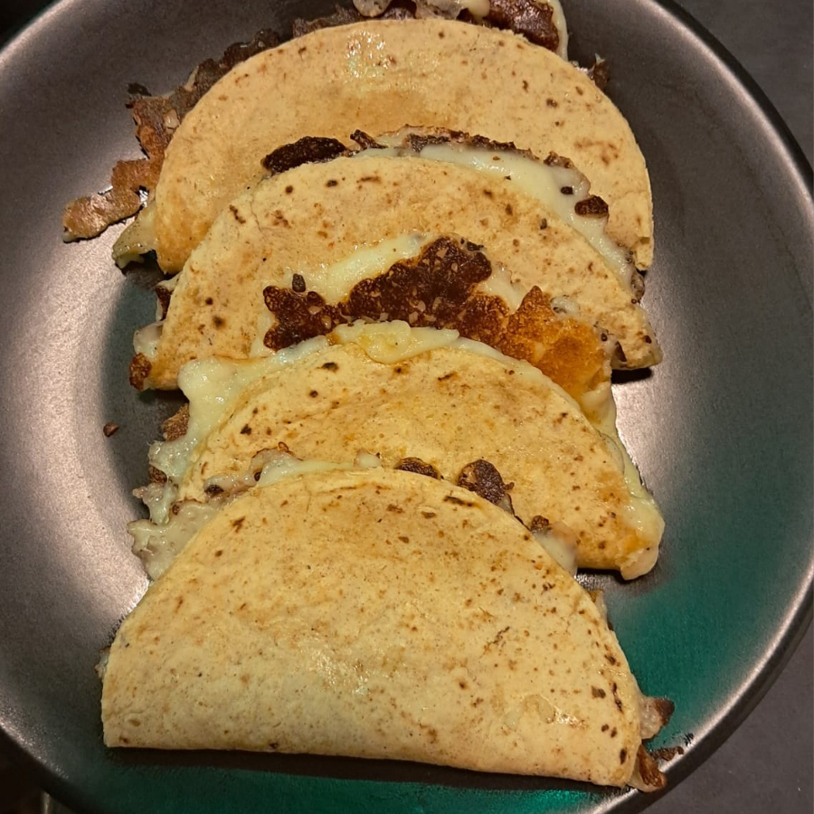 4 mini quesadillas de Maiz a la plancha, rellenas de queso Mozzarella fundido