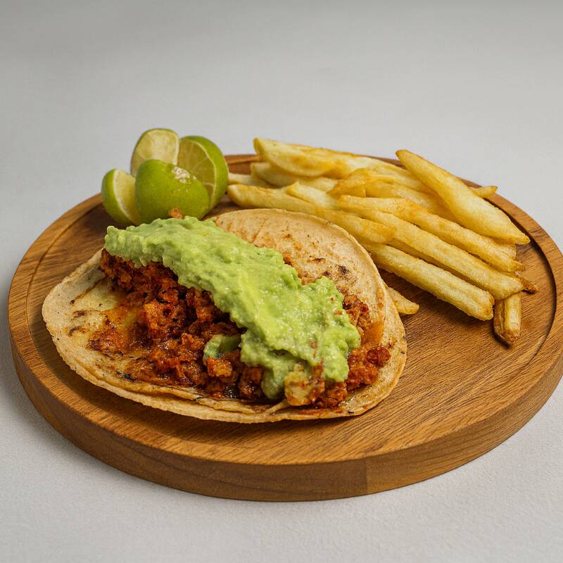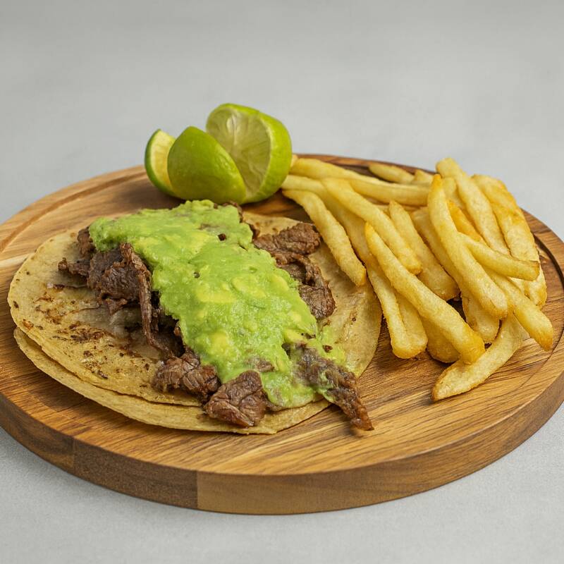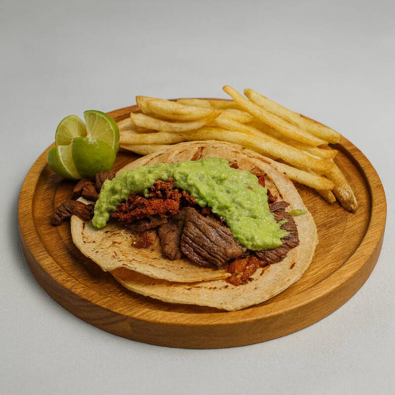 Taco XL preparado al momento en plancha, con carne jugosa, doble tortilla de maíz, costra dorada de queso Oaxaca, guacamole fresco en línea y papas fritas crujientes. Producto elaborado al momento para conservar sabor y calidad.